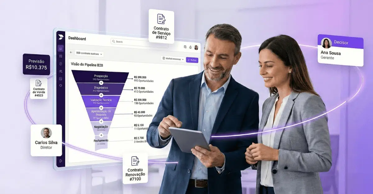 O CRM para empresas B2B é a plataforma de gestão comercial desenhada para suportar ciclos de vendas longos, múltiplos decisores e negociações consultivas. Diferente de ferramentas genéricas, ele centraliza o relacionamento, padroniza etapas do funil e gera previsibilidade de receita ao integrar processo, dados e pessoas.